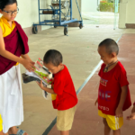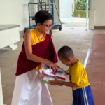 The new boys were introduced by Rinpoche and senior boys to the art of putting on a tie and tying their shoe laces.